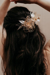 A crystalline jewel between wild nature and fine craftsmanship. The Ague comb unfolds with the grace of a flower frozen in time, evoking the poetry of Beauty and the Beast. Its free-flowing petals in transparent artisanal resin capture the light like glass, dressing the hair in a pure, untamed radiance.