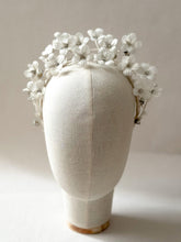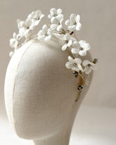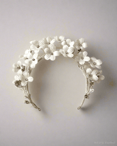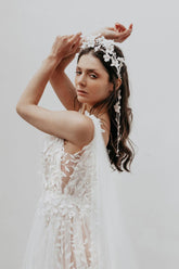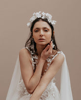 Crown yourself with a bloom of softness. The Aura crown celebrates floral delicacy with its petals meticulously crafted from soluble silk, offering a unique aerial lightness. Crystals and glass beads capture the light, creating a refined shimmer with every movement.