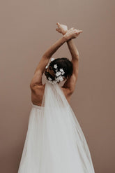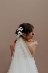 A cascade of light and softness. The Aura vine entwines in the hair like a precious thread. Its flowers, crafted from soluble silk for a unique airy texture, are sprinkled with crystals and glass beads that capture every ray of light.