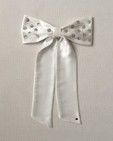 The Calista bow twines the luster of silver wires onto immaculate white satin. Heir to the art of "wire-breaking" (Tel Kırma), each embroidery captures light like a filament of moonlight, transforming this accessory into a precious heirloom piece.