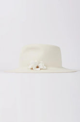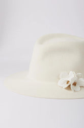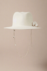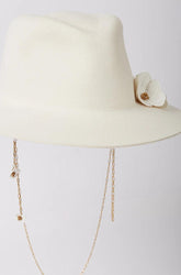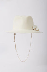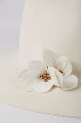 Born from an exclusive collaboration with Dilara Latrous, the Montblanc hat reinterprets timeless elegance. Crafted from 100% sustainable rabbit fur felt, it is enhanced by a "Hera" flower hand-sculpted in cold porcelain and a delicate chain adorned with floral buds.