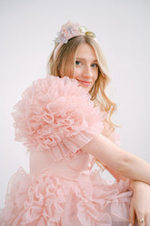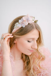 - Materials: Powder Pink Satin base & sculpted resin flowers.