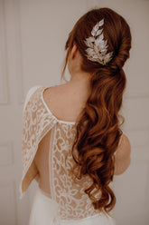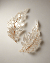A flight of lightness and elegance. This set of vines displays a symphony of delicate wings where each feather, hand-sculpted in pearlescent epoxy resin, captures the softness of flight. Worn symmetrically, they transform the hairstyle into a celestial caress.