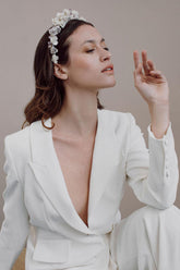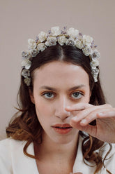 A hymn to timeless beauty. The Flora crown sits like a garden in eternal bloom. Its roses, hand-sculpted in artisanal resin and outlined with a metallic rim, transform your hairstyle into a living tableau of grace and romance.