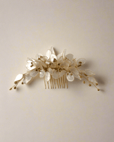 A blooming of nature and light, the Gaia comb unfolds in a translucent floral dance. Its epoxy resin petals capture the light like a dewdrop, while pearlescent green leaves and bronze beads weave a precious organic harmony.