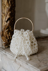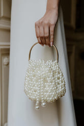 - Materials: Woven Ivory Pearls, Satin inner pouch & Gold metallic handle.