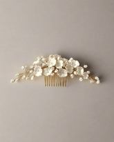 Harmony in motion. This comb marries the delicacy of baby's breath with the bloom of alcea, all hand-sculpted in cold porcelain. Its flexible stems allow you to adjust the composition to perfectly hug the curve of a bun or a half-up hairstyle.