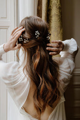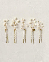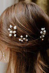 This set of five pins captures the lightness of baby's breath. Each twig, hand-sculpted in cold porcelain, slips into the hair to create a natural and airy floral constellation effect.