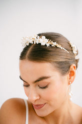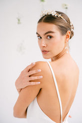 Harmonia Crown blends the silky finish of cold porcelain with the natural luster of freshwater pearls. A sculptural yet airy piece, designed to elevate the bride with a divine and modern presence.