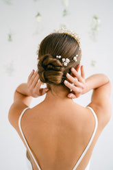 Scatter them in a bohemian braid, group them on a low bun, or place them to frame the face. The alliance of cold porcelain and freshwater pearls brings a delicate and timeless touch of light.