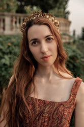 A true crown of flowers, the Helen crown captures the opulence of a garden in full bloom. Each flower, created in resin, is illuminated at its heart by a sparkling crystal, offering an aura of timeless majesty inspired by Greek goddesses.