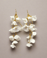 Celebrating the poetry of spring, the Hera Drop earrings form a suspended floral crown. Each flower, hand-sculpted in cold porcelain, dances elegantly at the end of a fine gold chain, capturing the lightness of a garden in full bloom.
