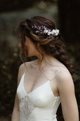 Like a twilight walk in a fragrant field, the Lavender jewel weaves a story of rustic softness. Its flowers, sculpted with striking realism in soft cold porcelain, capture the poetry of nature to enhance your hairstyle with a timeless romantic note.