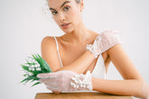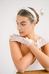 Resting on this semi-sheer veil, hand-sculpted cold porcelain Lily of the Valley bells add a sophisticated and timeless texture. Ideal for elevating a civil wedding outfit or a minimalist dress with a touch of organic romance.