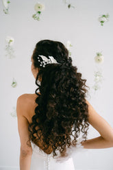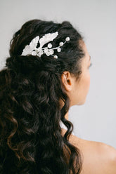 Composed of textured leaves and cold porcelain bells, this accessory contours the hairstyle with flexibility. Ultra-lightweight, it embodies timeless and refined elegance.