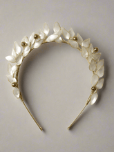 The aura of serenity. The Olea Crown is an ode to ancestral olive groves, an eternal symbol of peace and prosperity. Like dawn's light frozen in time, it crowns the bride with natural and majestic grace. Each leaf, meticulously crafted in Artisanal Resin with pearlescent reflections, intertwines with golden pearls evoking olive fruits.