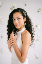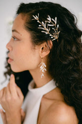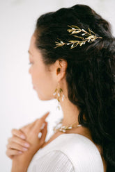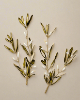 Translucent epoxy resin leaves play with transparency, while cold porcelain buds add a touch of organic softness. Ultra-lightweight and flexible, this accessory can be worn as a duo on the sides or scattered in a bun for natural elegance.