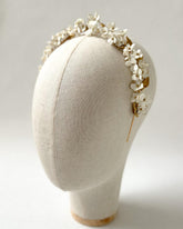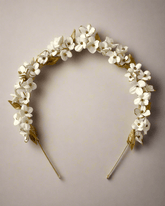 Blooming like a fairy tale garden, this crown marries hand-sculpted cold porcelain flowers with the radiance of bronze beads. A romantic harmony evoking the elegance of English gardens, inviting you to dream with majesty and softness.