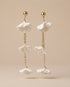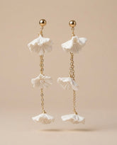 Ces boucles d'oreilles pendantes dévoilent une cascade de fleurs sculptées à la main en porcelaine froide, suspendues sur une chaîne plaquée or 24K carats. Une création fluide et aérienne qui accompagne chaque mouvement avec élégance, rehaussée par des cœurs en perles nacrées.