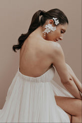 Une cascade de lumière et de rêves. Le Ear Wrap Aura épouse la courbe de l'oreille avec la tendresse d'une caresse printanière. Ses pétales en Pétales en soie soluble, nichés parmi des cristaux et des perles de verre, créent une danse d'éclat et d'élégance aérienne.