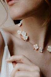 Un printemps éternel. Le Collier Chloé s'épanouit sur la peau comme un jardin suspendu. Chaque fleur, sculptée à la main en porcelaine froide, capture la délicatesse d'une nature en éveil.
