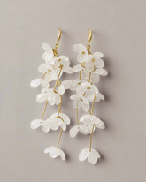 Véritables sculptures florales suspendues, les boucles d'oreilles Ersa descendent en une cascade aérienne. Leurs fleurs en acrylique semi-transparent, au fini mat et vaporeux, capturent une légèreté éthérée, créant un jeu d'ombre et de lumière à chaque mouvement.