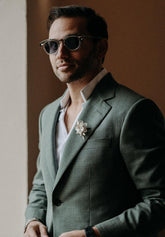 Parsemée de feuilles vertes lumineuses et de Perles d'Eau Douce, cette composition incarne l'équilibre parfait des éléments. C'est un fragment de nature éternelle conçu pour apporter une touche de sophistication champêtre au costume du marié.
