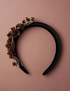 - Serre-tête en soie satinée noire, orné de roses en résine câblée bordeaux et or, et de charmes feuilles dorées.