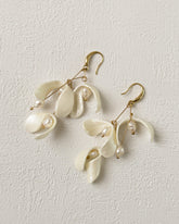 Ces boucles d'oreilles célèbrent le gui, symbole d'amour éternel. Les feuilles graciles, sculptées à la main en porcelaine froide, dansent aux côtés de véritables perles d'eau douce, reflétant la sérénité d'un paysage enneigé.