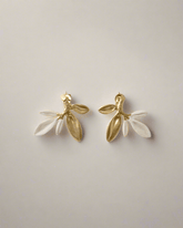 Hommage à l'arbre sacré d'Athéna, ces boucles d'oreilles entrelacent des feuilles en laiton plaqué or mat 16 carats et des feuilles sculptées à la main en porcelaine froide. Un design organique qui évoque la sagesse et la paix avec une élégance intemporelle.