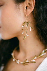 Les feuilles en résine époxy translucide jouent avec la transparence, tandis que les bourgeons en porcelaine froide apportent une touche de douceur organique. Montées sur crochets pour un mouvement fluide, elles sont ultra-légères et d'une élégance naturelle.